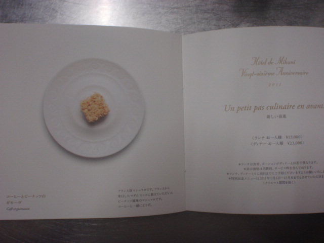 最初に三國シェフの言葉があります。その中に、『 3月には、上海市外難(バンドー)に「ミクニ上海」のオープンが決まりました。さらに次のステップとして、アメリカ、ヨーロッパへの進出を考えております。これまで以上にグローバルな料理が求められるであろうこの先10年。先陣を切って新しいマーケットを開拓し、後に続く若い世代の手本となれば、日本の料理業界の発展に役立つものと確信しております。海外での人生最後の挑戦をする覚悟です。』 と書かれてありました。